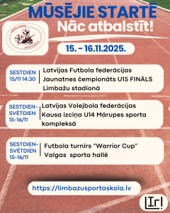 Vai esat gatavi sportiskai un azartiskai nedēļas nogalei? Vai balsis ievingrinātas un plaukstas iesildītas, lai skaļi atbalstītu savējos? Sestdien, 15.novembrī, plkst.14.30 mūsu U-15 futbolisti OC “Limbaži” stadionā tiksies ar ar Daugavpils komandu spēlē par 3.vietu Latvijas Jaunatnes čempionātā. 15. un 16.novembrī U-14 volejbolistes mērosies spēkiem Latvijas Volejbola federācijas Kausa izcīņā Mārupes sporta kompleksā, bet jaunie futbolisti Valgas sporta hallē cīnīsies “Warrior Cup”. Nu tad tiekamies tribīnēs!